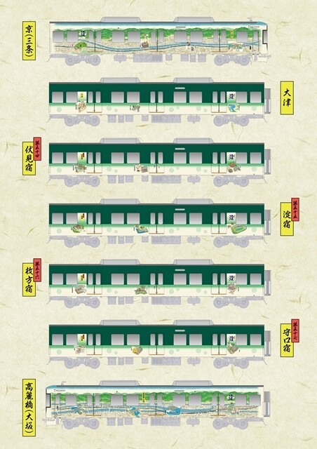 京阪電気鉄道13000系「東海道五十七次」浮世絵タッチのラッピング